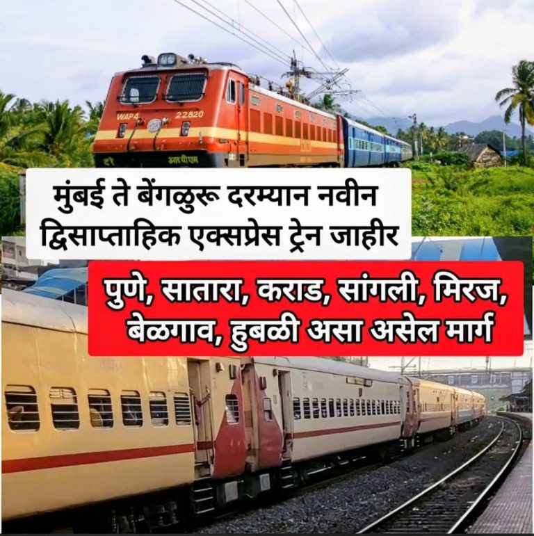 मुंबई दि.२९:- मिरज-दक्षिण पश्चिम रेल्वे विभागातून बंगळुरू-लोकमान्य टिळक टर्मिनस (मुंबई) दरम्यान नवीन एक्स्प्रेस गाडी नवीन वर्षापासून सुरू होणार आहे.🟢 आठवड्यातून...