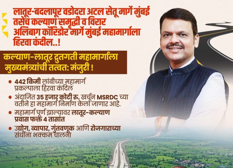 मुंबई दि.१७:- मुख्यमंत्री देवेंद्र फडणवीस यांनी ४४२ किमी लांबीच्या लातूर - कल्याण या द्रुतगती (Expressway) मार्गाची घोषणा केली आहे. लातूर...