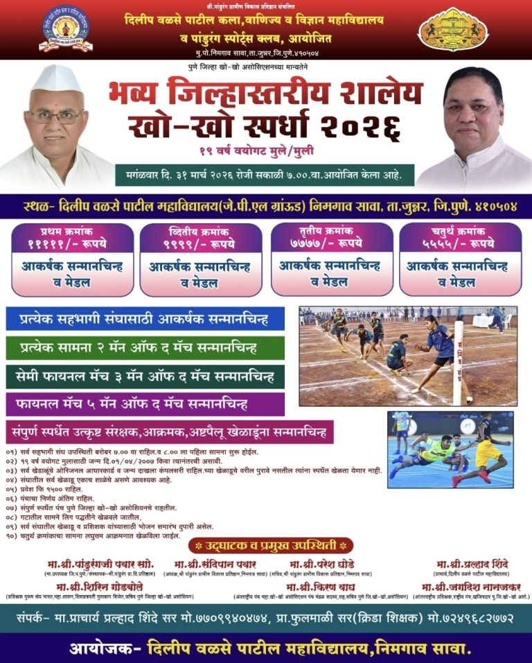 निमगाव सावा दि.३०:- श्री ग्रामीण विकास प्रतिष्ठान संचलित दिलीप वळसे पाटील कला, वाणिज्य व विज्ञान महाविद्यालय आणि श्री पांडुरंग स्पोर्ट...
