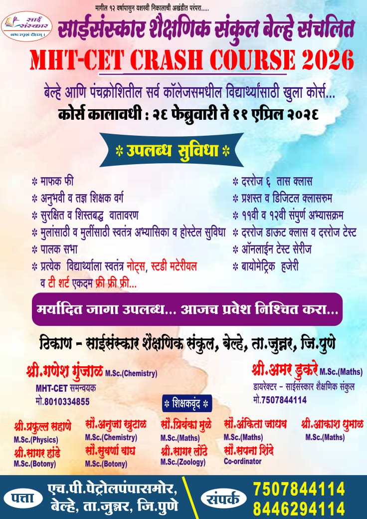 बेल्हे दि.२४:- साईसंस्कार शैक्षणिक संकुल बेल्हे संचलित MHT-CET CRASH COURSE- 2026 बेल्हे आणि पंचक्रोशितील सर्व कॉलेजसमधील विद्यार्थ्यांसाठी २६ फेब्रुवारी ते...