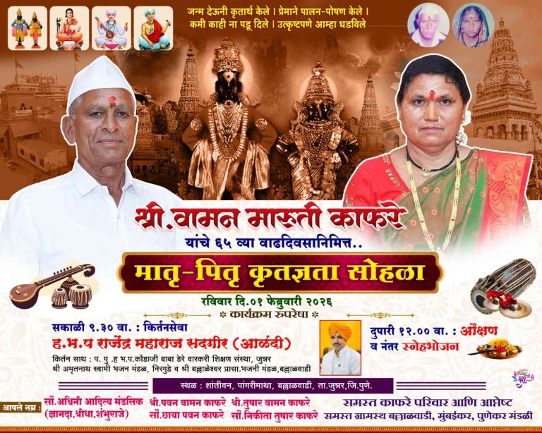 जुन्नर दि.३:- वामन मारुती काफरे यांच्या 65 व्या वाढदिवसानिमित्त आयोजित मातृ-पितृ कृतज्ञता सोहळा मोठ्या दिमाखात मु. पो. बल्लाळवाडी तालुका जुन्नर...