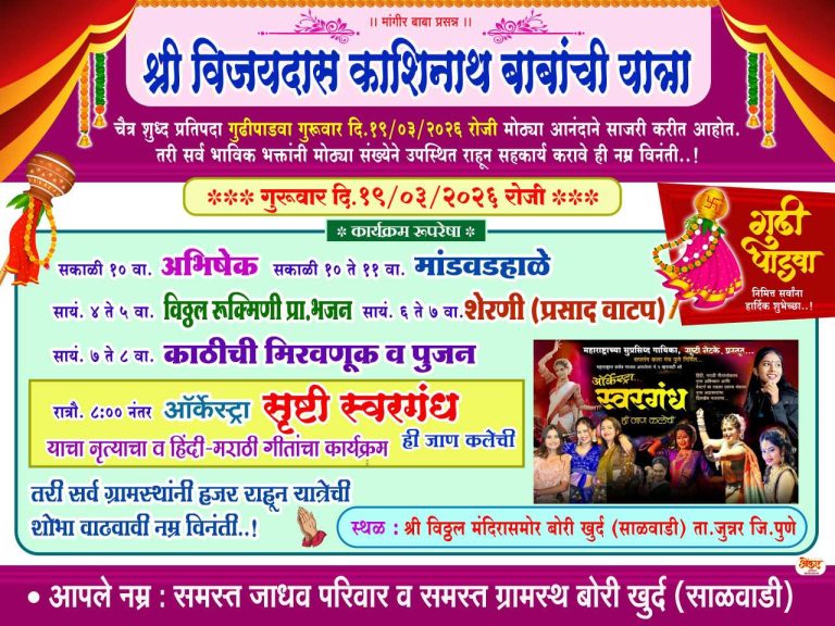 बेल्हे दि.१८:- बोरी खुर्द (साळवाडी ता.जुन्नर) येथे गुरुवारी दि.१९ रोजी गुढीपाडव्यानिमित्त श्री विजयदास काशिनाथ बाबांचा यात्रा उत्सव मोठ्या उत्साहाने साजरा...