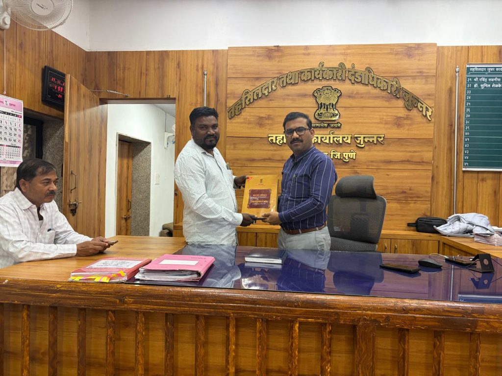 बेल्हे दि.२८:- संविधान दिनानिमित्त जुन्नर तालुक्यातील प्रशासकीय अधिकाऱ्यांना संविधानाची प्रत सत्यशोधक बहुजन आघाडी महाराष्ट्र राज्य यांच्या वतीने भेट देण्यात आली. यावेळी जुन्नर तालुका अध्यक्ष उत्तम वायदंडे, मनेश अल्हाट, रामभाऊ खंडागळे, कैलास बोबाटे, राहुल गायकवाड, रवींद्र साळवे यांसह अनेक कार्यकर्ते उपस्थित होते.