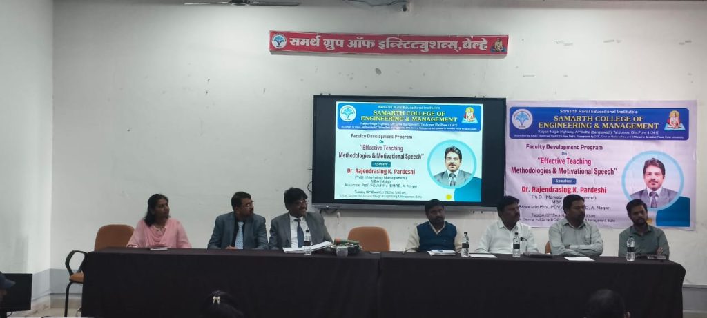 बेल्हे दि.१:- समर्थ रुरल एज्युकेशनल इन्स्टिट्यूट संचलित समर्थ कॉलेज ऑफ इंजीनियरिंग अँड मॅनेजमेंट बेल्हे येथे नुकतेच ३ दिवसीय शिक्षक-प्रशिक्षण (फॅकल्टी डेव्हलपमेंट) कार्यक्रमाचे आयोजन करण्यात आले होते. डॉ.राजेंद्रसिंह परदेशी यांच्या हस्ते दीपप्रज्वलन व प्रतिमा पूजन करून मान्यवरांच्या उपस्थितीत या तीन दिवसीय कार्यक्रमाचे उद्घाटन करण्यात आले.