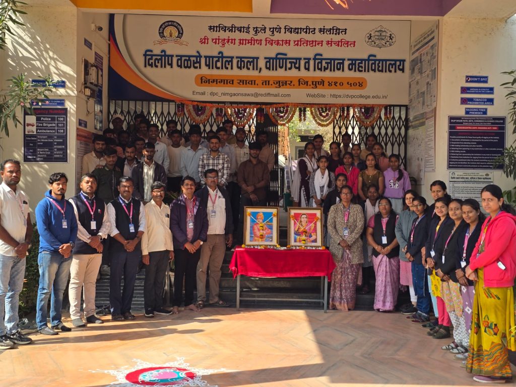 निमगाव सावा दि.१३:- निमगाव सावा (ता. जुन्नर) सावित्रीबाई फुले पुणे विद्यापीठ संलग्नित श्री पांडुरंग ग्रामीण विकास प्रतिष्ठान संचलित दिलीप वळसे पाटील कला वाणिज्य व विज्ञान महाविद्यालयात दि.१२ जानेवारी २०२६ रोजी राजमाता जिजाऊ व स्वामी विवेकानंद यांच्या जयंतीनिमित्त संयुक्त कार्यक्रमाचे आयोजन करण्यात आले.