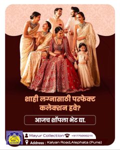 मयूर कलेक्शन मध्ये लग्नकार्यासाठी साड्यांच्या असंख्य व्हरायटीज उपलब्ध आहेत. येथे साडी महोत्सव सुरू असून स्टायलिश लुक साठी मयूर कलेक्शनला ग्राहकांची पसंती मिळत आहे.