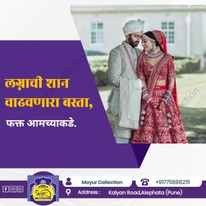 ‘नाविण्यपुर्ण’ व ‘अप्रतिम’ व्हरायटीज् उपलब्ध आहेत. लग्नाची खरेदी सर्वात स्वस्त मयूर कलेक्शन मध्ये होत असल्याने ग्राहकांची खरेदीसाठी लगबग सुरू आहे. मयूर कलेक्शन मध्ये लग्न समारंभासाठी वर पक्ष व वधूपक्षासाठी लागणारे सर्व कपडे,