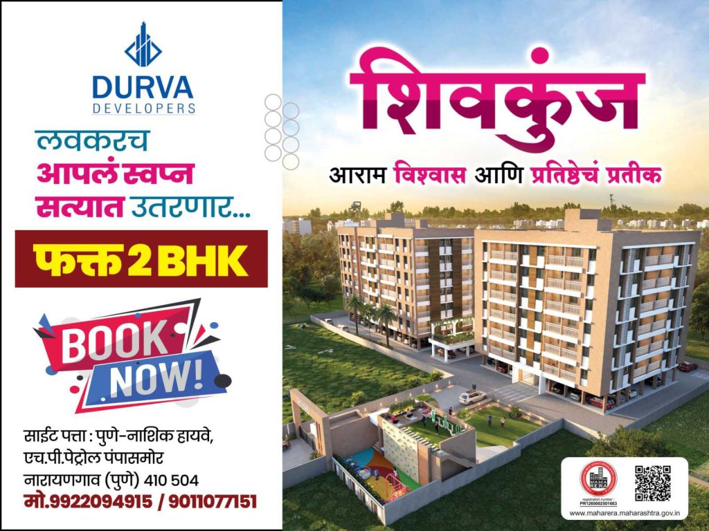 नारायणगाव दि.१४:- नारायणगाव (ता. जुन्नर) येथे “दूर्वा डेव्हलपर्स” चा शिवकुंज हा 2 बीएचके चा भव्य प्रकल्प साकारत असून अक्षय तृतीयाच्या शुभमुहूर्तावर घर घेण्याची सुवर्णसंधी उपलब्ध झाली आहे.’दूर्वा डेव्हलपर्स’ लवकरच आपलं स्वप्न सत्यात उतरवणार असून आराम, विश्वास आणि प्रतिष्ठेच प्रतिक मानले जाणारे.
